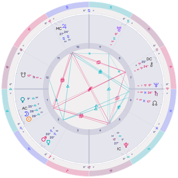 No final da temporada de Libra, temos uma Lua Nova a 28°21′. Esta formação é uma quadratura em T dinâmica com Júpiter em Câncer a 24° e Plutão em Aquário a 1°. Embora a oposição entre Júpiter e Plutão seja ampla (cerca de 7 graus), estou incluindo-a porque ambos os planetas são influências sociais e geracionais de movimento lento, e sua energia tensa é indicativa do que está acontecendo agora em todo o mundo. No Software Luna Astrology, este aspecto aparece como uma linha sólida, indicando influência significativa. O mesmo se aplica ao website Astro.com, enquanto o Astro-Seek o apresenta como uma linha pontilhada, sugerindo uma influência secundária que ainda reflete a energia em jogo. É verdade que sei que existem astrólogos que podem usar um orbe de influência mais estreita, mas não acho que possamos negar o poder e o grande esquema de Plutão em relação aos eventos atuais.