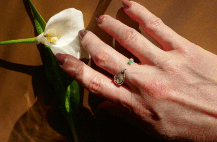 Desenvolvido por Neva, este anel é uma joia que une arte, natureza e simbolismo. Inspirado na pureza e na delicadeza da flor Copo de Leite, sua forma orgânica em prata maciça evoca suavidade e harmonia. No extremo oposto, um raro cristal de Esmeralda Colombiana de Muzo brilha com seu verde profundo, símbolo de renovação, prosperidade e conexão com o coração. Cada detalhe foi pensado para transmitir equilíbrio entre a força da prata e a sutileza das curvas naturais, resultando em uma peça atemporal que carrega beleza e significado.